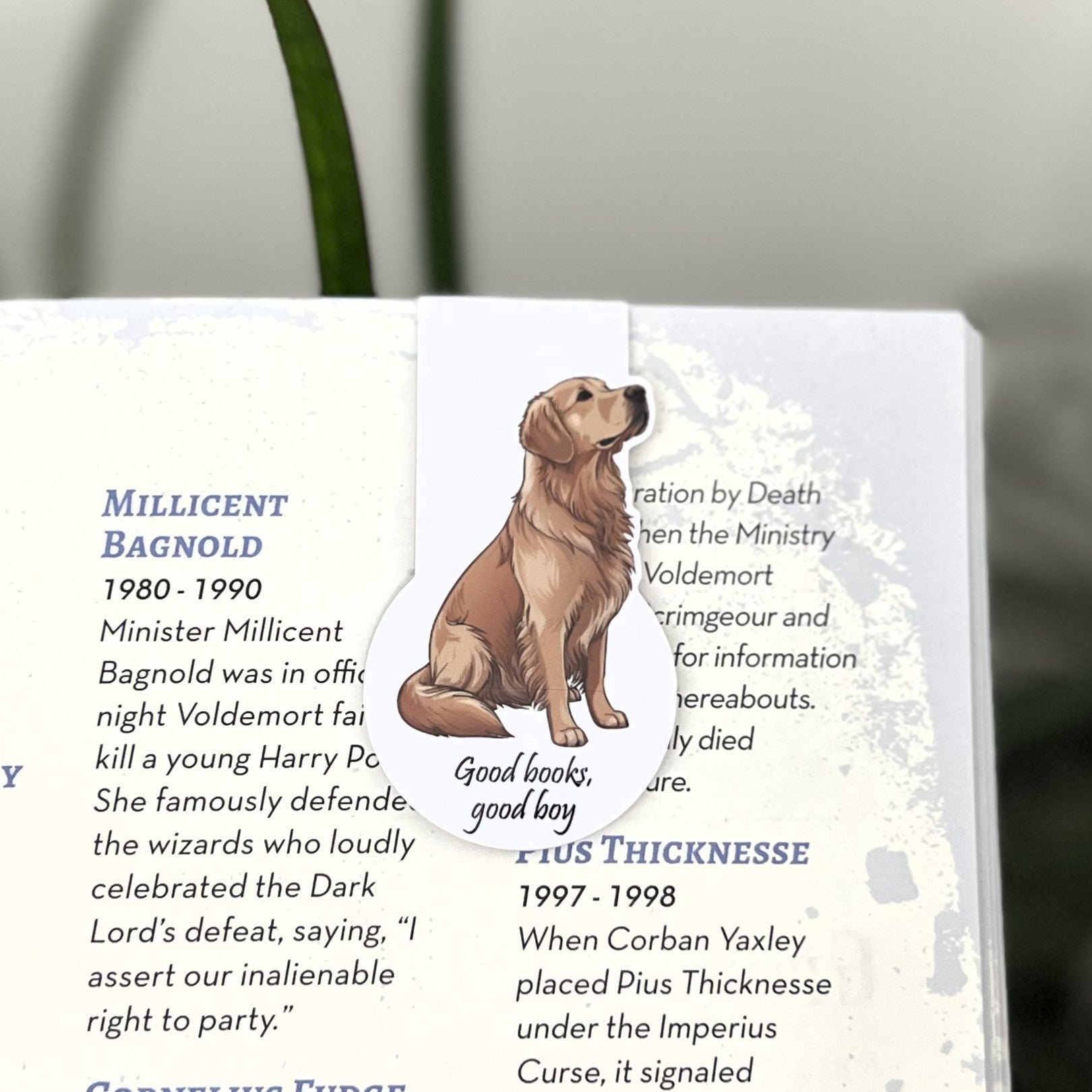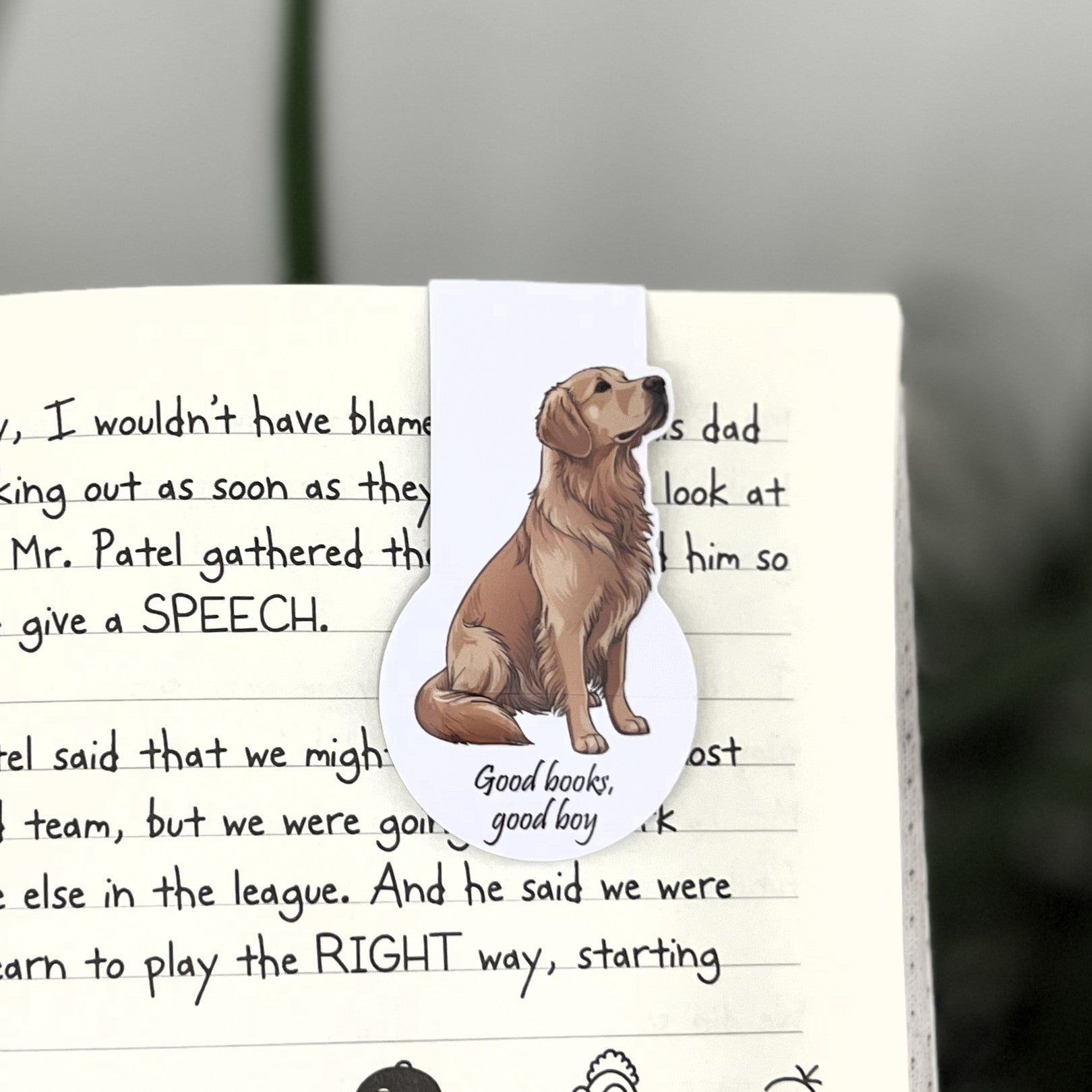 Keep your place in style with this charming magnetic bookmark featuring an adorable dog and the phrase "good books, good boy." Perfect for dog lovers and avid readers alike, it securely clips onto pages without damaging them. Enjoy a blend of practicality and personality every time you open your favorite book.